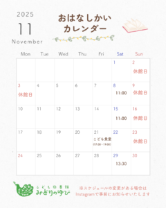 週末、こども図書館みどりのゆびでは、えほんの読み聞かせ「おはなしかい」を開催しています。11月の予定は下のカレンダーの通りです。事前申し込みの必要はありませんので、お気軽にご参加くださいね。